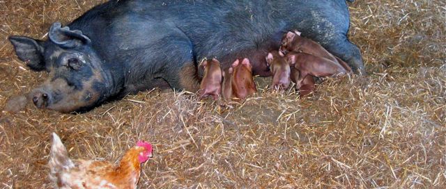 Beautiful babies ! Our chickens also hang out with our pigs often resting on top of them for worth. Great way to keep parasites under control in the pig pastures.