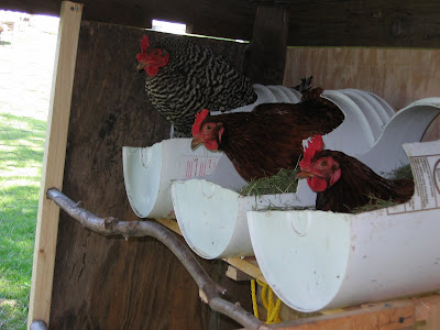 Here is a quck picture of three of our hens in the laying boxes … errr … buckets. They are just free 5 gallon pails from the grocery store that I cut up with my jig saw. It took them a day or so to get used to them, but for the past two days we have picked out 5 eggs each day!