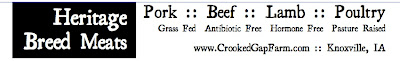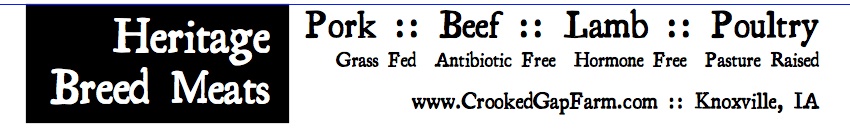 Okay … the first farmer’s market is coming up very quickly and I need some serious help on a sign for the tent. I am feeling sort of uncreative at the moment which is why I have seven sign ideas instead of just one. I feel like I’ve tried to cram too much information onto the signs, but here they are anyways. You may have noticed that I’m focusing on the “heritage breed meats” thing a lot instead of the farm name. Part of that is because the heritage breeds are something important to the farm and I’m new to the market so it helps differentiate me from the other livestock farms there. And part of it is … well it is because I got stuck on that phrase. Please let me know if there is one You particularly like … or if I should just go with a simple “Crooked Gap Farm” sign. Just place your vote in the comments, and as always … thanks for the help!